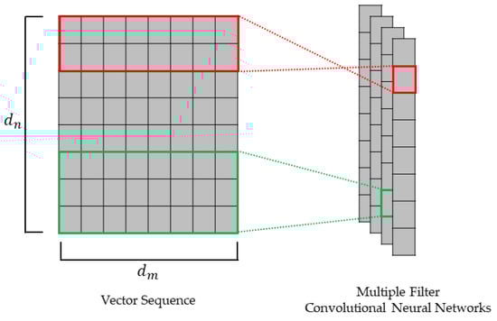 CNN is known to have excellent performance not only in image processing but also in NLP. The convolution layer in NLP is characterized by 1-dimension operation on text data [21,22,23,24]. Figure 3 describes the process of extracting local features from a vector sequence through multiple filter 1-dimensional CNN (1D-CNN). The vector sequence of syllables and morphemes is expressed as follows: