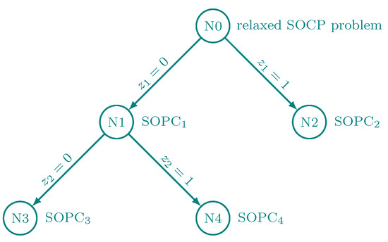 The B&B method departs from a solution of a SOCP problem where the variables are considered continuous. This solution is named as and constitutes a lower bound for the MI-SOCP problem. Next, a series of SOCP optimization problems are solved for integer partitions of , as depicted in Figure 2. Each SOCP problem has continuous variables, and hence it can be solved efficiently despite having a high amount of variables. The method continues until a binary solution is obtained. Other approaches, such as outer approximation, cutting-plane methods, and generalized benders decomposition, can be used to solve MI-SOCP (see [27] and the references therein for a complete review of MI-SOCP). However, most of the solvers that allow solving MI-SOCP use B&B. Since our approach is application-oriented, we will rely on the solution given by these solvers.