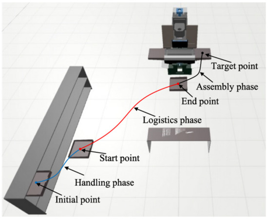 The assembly paths of different parts in a complex product are varied; thus, it is difficult to reuse an assembly path completely. A feasible method is to segment the assembly path and then reuse it [52]. Based on a method of segmenting the assembly path into two phases, the assembly path of a part is divided into three phases in turn by four key positions of the part from the shelf to assembly in this paper, as shown in Figure 1. The four positions are the initial point, the start point, the end point, and the target point, and the three phases are the handling phase, the logistics phase, and the assembly phase.