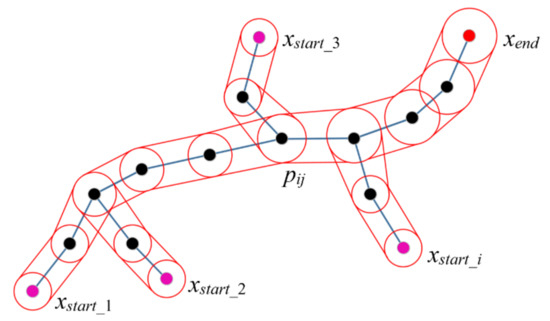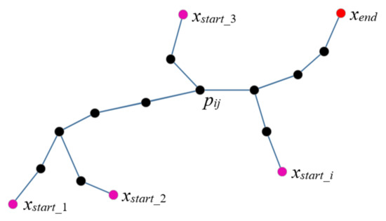 In this paper, in addition to the obstacle space and the free space, the configuration space also contains the prior path space constructed by the planned assembly paths. The paths in the prior space constitute a prior path set, which is described by a tree structure, as shown in Figure 2. Each prior path is composed of the nodes in sequence from the start node (the leaf node) xstart_i (i = 1, …, m) to the end node (the root node) xend with some nodes pij (i = 1, …, m; j = 1, …, n) between them. Therefore, the path planning for the logistics phase in the assembly space is converted into a non-interference path search from the start node to the end node in the configuration space.