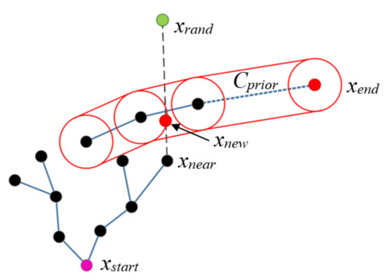 A path planning algorithm based on RRT expands the path by generating random points in the configuration space and detects collision interference by connecting the points with lines. If a prior path is represented only by some nodes of the tree, the probability that the sampling points happen to be generated on these nodes is extremely small. Therefore, a prior path tree is inflated into a prior path space [54] which is helpful for improving the reusability of a prior path.