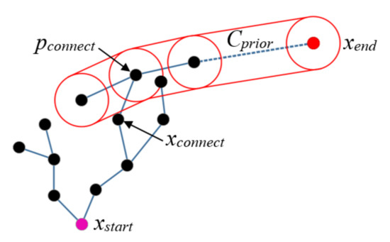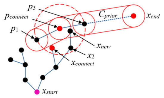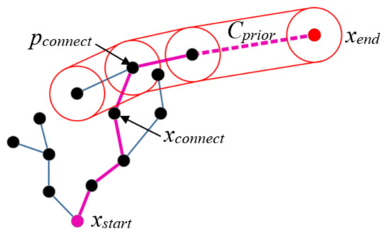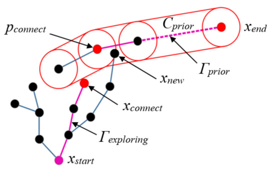 The path obtained according to the dual-tree fusion strategy is divided into the following two segments by the connection point pair (xconnect, pconnect): the prior path segment Γprior from the end node xend backtracking to the connection node pconnect on the prior path tree Tprior and the exploring path segment Γexploring from the connection node xconnect backtracking to the start node xstart on the exploring path tree Texploring, as shown in Figure 11.