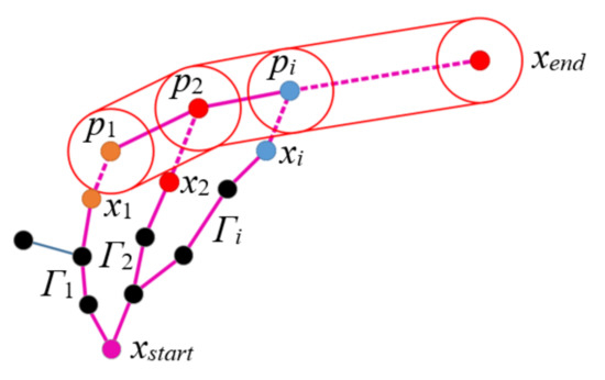 Since xnew is randomly generated in the prior space, the connection node pair (xconnect, pconnect) obtained by using the dual-tree fusion strategy may be different, such as (x1, p1), (x2, p2), and (xi, pi) shown in Figure 13; thus, the paths obtained according to these pairs are also different, indicated by Γ1, Γ2, and Γi, respectively, as shown in Figure 14.