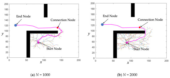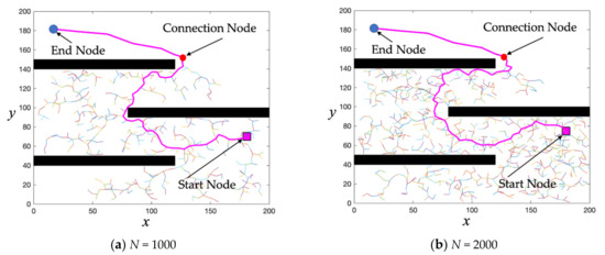 Figure 17 and Figure 18 show that path planning using the PPR algorithm is completed even when the number of sampling points is small. Moreover, as the number of sampling points increases, the exploring path segment becomes asymptotically optimal. Since the weight of the prior path is greater than that of the exploring path, the connection node gradually approaches the end node, and the prior path segment of the final path is asymptotically the shortest.