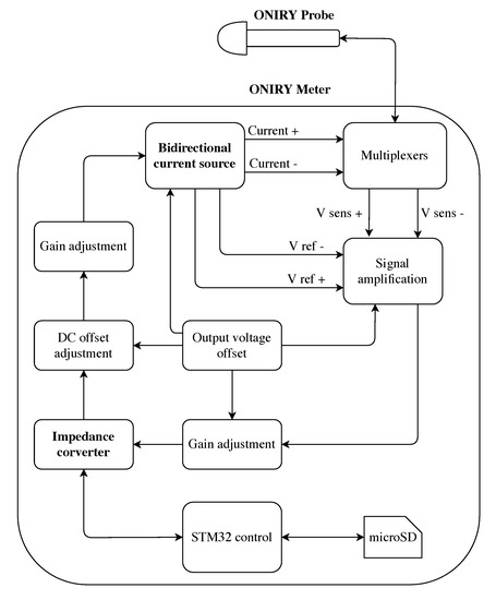 The ONIRY Meter is an impedance spectroscopy device. It allows for measuring bioimpedance of the tissues through the ONIRY Probe. The main parameters measured were impedance module and impedance phase shift. The impedance was established based on Ohm’s law. The module can be calculated as the square root of the sum of resistance and capacitance, both squared. The phase shift can be estimated by finding the arc tangent of the ratio between capacitive and resistive components. All are calculated by the device. A block diagram of the version used in the study is shown in Figure 1.