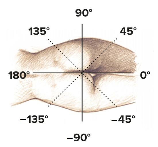 We decided to evaluate the performance of machine learning binary models using an ultrasound-based OASI classification (, which corresponds to no injury of the anal sphincter muscles vs. the presence of injury of the sphincter muscles) and clinically-based Wexner scale (=0 , which corresponds to no problem with any type of incontinence vs. the presence of a problem with stool or gas incontinence). However, as only a small number of participants was ultimately diagnosed with a sphincter injury (grade more than 2 in OASI classification) and as for those women sphincter damage occurred only in the anterior part of the anal canal, “injured” label outputs were marked only on measurements for angles −45, 0, and 45 degrees that corresponded to the part of the sphincter periphery from the side of the birth canal (where the injuries occurred), as shown in Figure 3. The rest were labeled as “non-injured”. That approach gave 9 results labeled as injured and 151 labeled as non-injured for OASI classification. For the Wexner scale, it was 24 and 136 respectively for injured and non-injure labels.