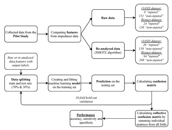 For each method and output, collective (after 10 splits into training sets—70% of data and test sets—30% of data, applied to increase the robustness of the results) 2 × 2 confusion matrices were calculated based on the test sets. The effectiveness of each algorithm was assessed by calculating its accuracy, sensitivity, and specificity. The data analysis process is presented in Figure 4.