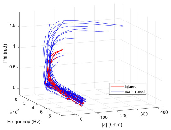 For each measurement, impedance data were split into 8 groups according to 8 frequency sub-ranges within a 1–100 kHz range (so that each subgroup had the same number of frequencies for which the measurement was performed):
