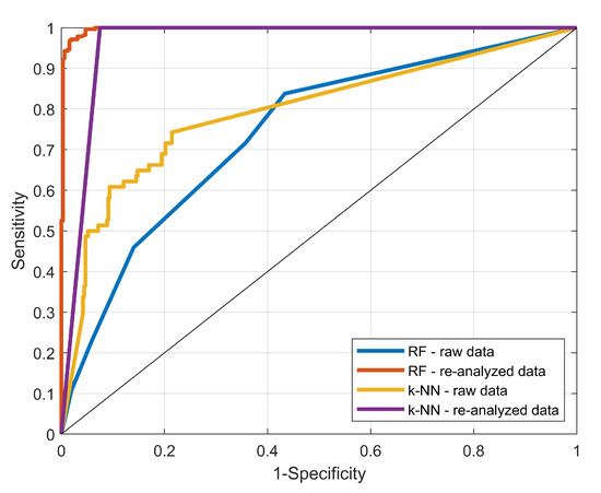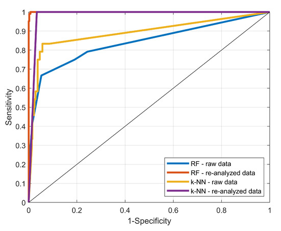 The ROC (Receiver Operating Characteristic) curves for two outputs, OASI classification and Wexner scale, are presented in Figure 7 and Figure 8, respectively. They take into account two considered classification models (k-NN and RF), and two datasets (raw and re-analyzed).