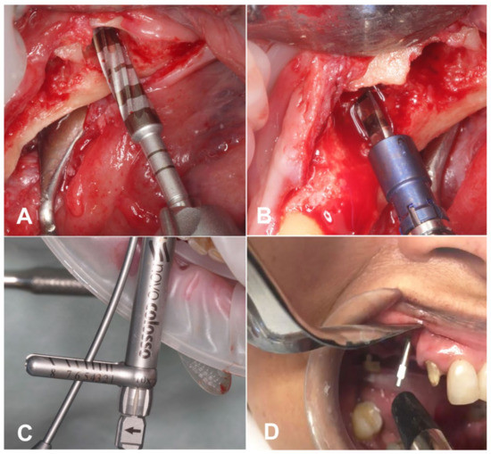 - Machado, R.C.M.; da Gama, C.S.; Batista, S.H.; Rizzo, D.; Valiense, H.; Moreira, R.F. Tomographic and clinical findings, pre-, trans-, and post-operative, of osseodensification in immediate loading. Int. J. Growth Factors Stem Cells Dent. 2018, 1, 101. [Google Scholar] [CrossRef]