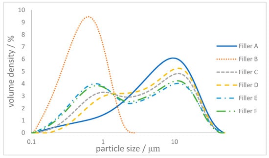 In the context of the study reported here, it is enlightening to consider the particle size distributions, Figure 1, in a little more detail. Taking note of the logarithmic size scale, the fine component, Filler B, displays a close to perfect Gaussian (bell-shaped) curve, which indicates a log-normal distribution, and the volume median dv50 size equals the mode, or most commonly present particle volume size. The nature of calcium carbonate when ground in water leads to a dynamic dissolution and re-precipitation of ultrafine particles, and, in addition, the grinding process itself creates fines from the desired larger particles in Filler A. This leads to a distinctive skew of the distribution, such that not only the desired coarse material is obtained, but also at least 10 v/v% of the sample consists of particles that cover the range of the distribution for the fine Filler B. For the purposes laid out here, the overlap in fines is advantageous since the process requires a number of properties that benefit from a broad size distribution, such as filler particle powder flowability, sufficient surface area even of the coarse fraction to provide composite homogeneity and to support controlled polymer crystallization nucleation. The presence of fines in the coarse fraction also supports a mid-range particle size continuity in the bimodal mix of coarse and fine materials, which supports the uniformity of compounding and acts against settling and/or demixing. Furthermore, the volume median dv50 lies away from the mode volume size for the coarse fraction, such that the volume capacity, and, therefore, heat capacity is represented by particles considerably larger than the median. Conversely, the majority of the surface area of the coarse fraction, Filler A, is contributed by the fines it contains.