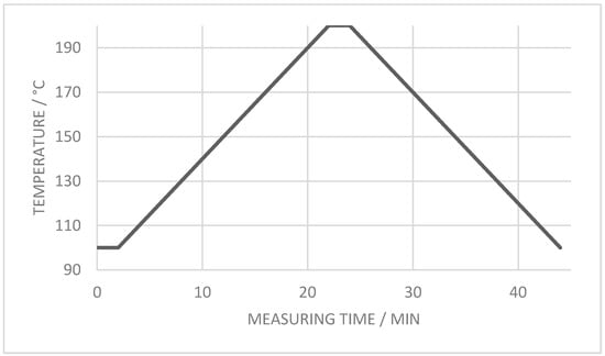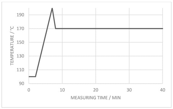 To generate additional knowledge of the detailed crystallization kinetics, the crystallization time was recorded over a range of different constant temperatures to provide a record of the material’s isothermal response []. The samples (once again ~7 mg) were heated to 100 °C, kept at this constant temperature for 2 min, then heated up to 200 °C at a rate of 20 °C min−1, followed by cooling down with a cooling rate of −40 °C min−1 and finally kept at the chosen measuring temperature of 170 °C to analyze the crystallization time. Figure 3 shows the schematic temperature program used for determining the crystallization time.