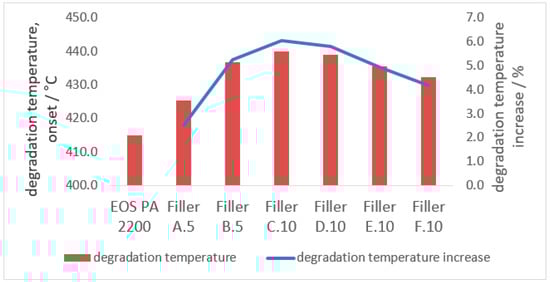- The degradation temperature of the polymer compound can be increased by up to 6% with the implementation of at least 10 m2 of the coarse and 80 m2 of the fine filler fraction within 100 g of polyamide 12;