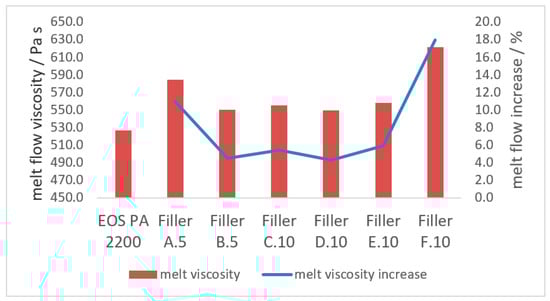 As it was already shown in the previous investigation, the increase in the melt flow due to the introduction of a solid mineral filler shows a significant dependency on the filler particle size as well as the processing-induced filler surface in the compound matrix. Figure 6 shows how the melt flow increased more significantly if only 10 m2 of coarse mineral filler is implemented into 100 g of polyamide 12 instead of finer mineral filler. Blending the same amount of coarse filler material with a finer fraction showed no significant increase in the melt flow. Therefore, the overall increase can be reduced by approx. 50%. Sample ‘Filler F.10′ shows how the melt flow increases up to 20% if the fine mineral filler fraction exceeds the optimum range. This effect was shown by using finer filler particles with a smaller single-particle volume than that of coarser filler particles. This results in a better melt flow in comparison with the implementation of only coarser calcium carbonate particles. This results in a better melt flow during a selective laser sintering print, hence higher final part density.