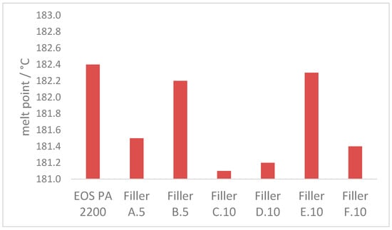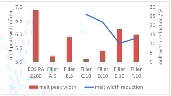 Figure 7 and Figure 8 show how the melting point can be manipulated with the introduction of a precise amount of coarse mineral filler into the polymer matrix. The possible melt-point reduction of approx. 1 °C with the implementation of 10 m2 of coarse mineral filler (Filler A.5), can also be achieved with Filler C.10, Filler D.10, as well as Filler F.10. All three filler combinations introduced approx. 10 m2 of coarse filler material, where the finer filler fraction varied and did not show any significant effect on the melt point manipulation. Referring to the particle size distribution of the coarse fraction in Figure 1, the sensitivity of melting point to the use of a small amount of coarse filler A in the blend relates to particles significantly larger than the volume median, dv50, which control the thermal properties more strongly. Filler E.10 showed how the melting point is not affected if the coarser mineral filler fraction is reduced below the optimum range of 10 m2 per 100 g polymer matrix. The same effect can be seen in Figure 7, which shows the melting transition width behavior, given by the peak width of the total time over which the melt transition occurs. The melt peak width can be reduced by up to 25% if the compound is filled with 10 m2 of coarse filler material within 100 g of polyamide 12. Filler E.10 and F.10 showed how an extensive amount of the fine filler fraction masks the benefits of the coarser fractions. Considering the difference in the thermal properties between the functional filler and the polymer matrix (higher thermal conductivity and lower specific heat of calcium carbonate), the energy taken up by the filler material is taken up quickly and released more rapidly to the polyamide 12, surrounding the filler particle. More thermal energy can be transmitted due to the greater single-particle volume of the coarser calcium carbonate particles, in comparison with a multitude of single fine filler particles. This results in a greater influence on the melting behavior of the compound with the inclusion of a few coarse instead of many fine calcium carbonate filler particles []. The extensive number of fine filler particles take up all the energy and therefore hinder the more ready distribution of the stored energy by the coarser fraction. This results in the loss of the melt energy efficiency effect given by the coarse calcium carbonate filler particles.