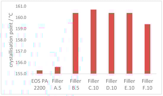 Figure 9 reveals how the increase of the crystallization point can be achieved if an optimized amount of fine calcium carbonate filler particles is present in the blend. Filler A.5 shows the purely coarse fraction, implemented into the polymer matrix, does not influence the crystallization point. This can be explained by the reduced filler particle number in the compound at a given mass loading of the coarse-only filler when compared with the case of many more submicrometer/nanoscale calcium carbonate particles in the polymer matrix. It is the greater single-particle number and homogeneous distribution of fine filler particles, when present within the polymer matrix, which promotes more frequent points of nucleation for crystallization to occur during the temperature reduction phase, resulting in a larger/more rapid onset at the point of crystallization [].