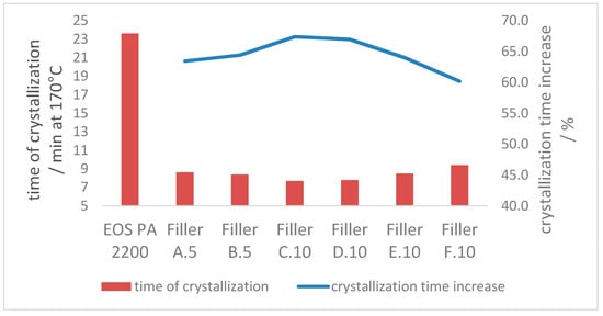 Figure 10 reflects the results shown in the previous investigations. With the addition of an increased surface area of calcium carbonate filler material within the polymer matrix, the crystallization kinetics show a filler surface area dependency. Even a low, coarse filler loading, as with the low addition level of Filler A.5, the crystallization time at a constant 170 °C can be reduced by approx. 60%. This manipulation of faster crystallization rate remains supported even when large numbers of fine filler particles are added. These findings support the hypothesis that the crystallization point is dependent on particle number, i.e., available nucleation points.