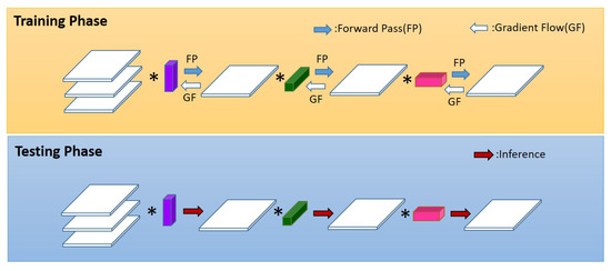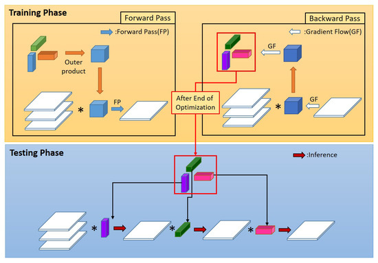 Figure 4 explains the training process with the proposed network structure in detail. At every epoch of the training phase, we first take the outer product of the three 1-D vectors , , and . Then, we assign the result of the outer product to the weight values of the 3-D convolution filter, i.e., for every weight value in the 3-D convolution filter , we assign