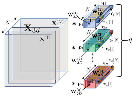 where ∗ and ⊛ denote the 3-D and the 2-D convolution operations, respectively, and refers to the j’s component of the vector . Figure 3 visualizes how the 3-D rank-1 filters are constructed and how they convolve with the 2-D channels in .