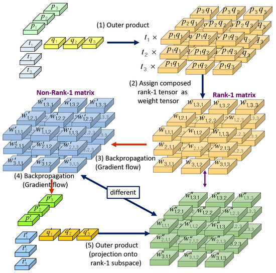 At the next feed forward step in the back-propagation, an outer product of the updated 1-D vectors , , and is taken to concatenate them back into a 3-D convolution filter , which we call the tensor composing step:
