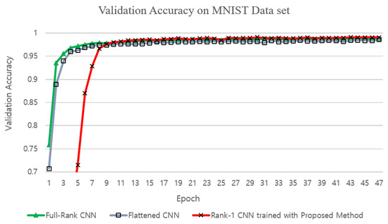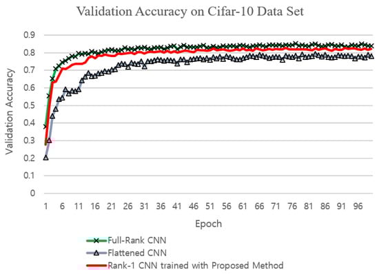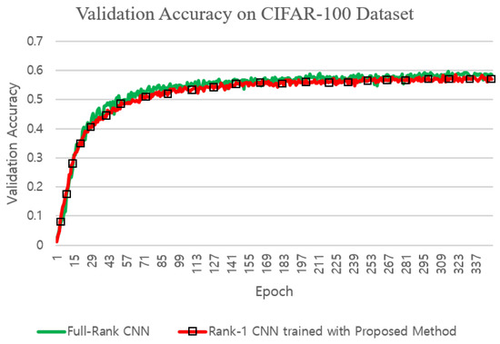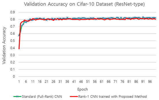 Figure 8 compares the validation accuracies of the networks with ResNet structures composed of standard 3-D filters and rank-1 3-D filters, respectively, where the rank-1 3-D filters were trained with the proposed training method. We used the 56-layer ResNet structure for CIFAR10 as proposed in [50], and replaced all the standard 3-D filters by rank-1 3-D filters in the ResNet in the experiments with the proposed training method. As can be seen, the rank-1 ResNet trained with the proposed method achieved similar validation accuracy to the normal ResNet, which shows that the proposed training method can be applied to diverse network structures containing low-rank filters.
