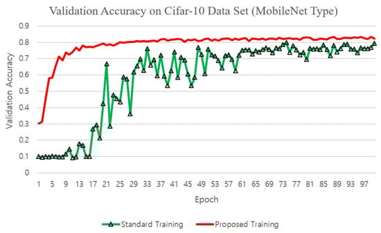 Comparison of validation accuracies on the CIFAR10 dataset with the proposed and the standard training methods for the MobileNet.