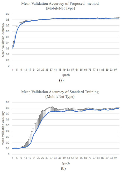 Comparison of mean validation accuracies on the CIFAR10 dataset with the proposed and the standard training methods for the MobileNet. (a) Mean validation accuracies of the proposed training method (vertical bars show the positive standard deviation); (b) mean validation accuracies of the standard training method (vertical bars show the positive standard deviation).