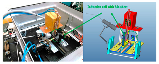 Experimental set-up of induction heating of Mo sheet, Right—the 3D projection of the heating coil with Mo sheet and required assembly, Left—the physical prototype of proposed induction heating system.