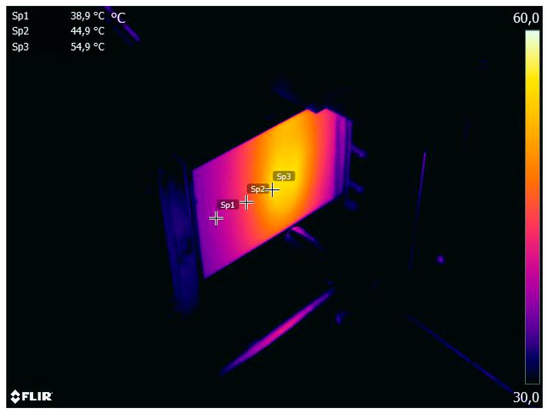 Table 2 evaluates the relative error between measurement and simulation at selected reference points. It is seen that the maximal error for a given situation reaches 2.52%, which presents acceptable deviation as the superior performance of simulation models is acceptable up to 5% of the relative error [17,18,19,20]. As measuring equipment, thermal infrared camera FLIR SC 640 was used, whose measuring accuracy is defined as 0.2 °C.