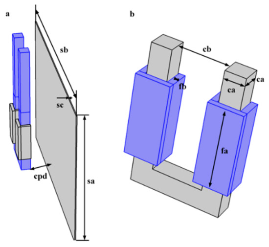 The model comprises the Mo sheet, a heating coil with a magnetic core (Figure 4). The molybdenum sheet is modeled as a block (domain) with a required width (sa), depth (sb), and thickness (sc). The coil’s winding is designed as a square domain with a required thickness (ca) and the required size (cb). The coil’s core is represented by the ferrite blocks whose parameters are also reconfigurable, i.e., ferrite height (fa) and ferrite thickness (fb).