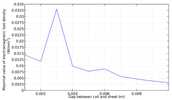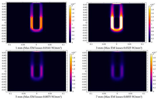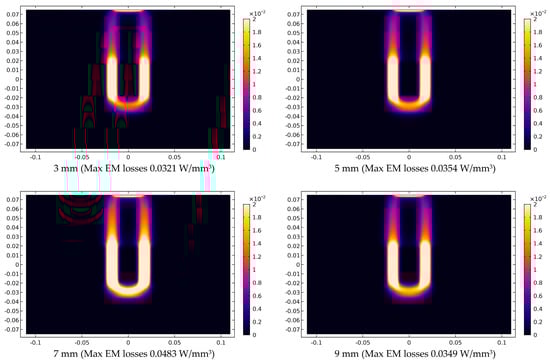 The rule that the close induction coil to the sheet is, the higher heating power will be generated is not valid because of the induction heating’s physical principles, which is influenced by the system’s operation frequency and resonance, which occurs for a given distance [21,22,23]. Figure 5 shows that the peak power is generated at the 3 mm of the gap, while below and above this value, volumetric loss decreases. For a better interpretation of the results, the distribution of these losses is shown in Figure 6.