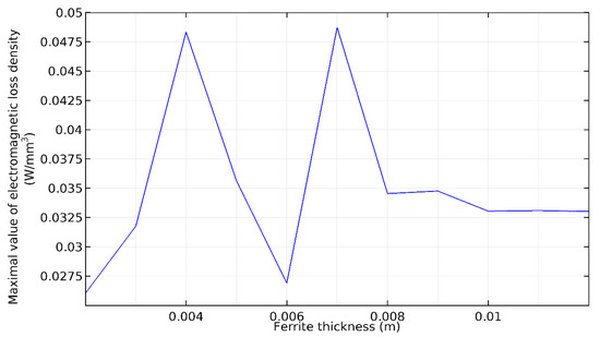 From Figure 7, the fluctuations of the electromagnetic loss density located at the molybdenum sheet are seen during the parametric change of the thickness of the ferrite core. This fact is related to the variations of the ferrite core’s electromagnetic excitation when its thickness is being changed. Thus, it is valid here that for the given thickness of the ferrite core and the applied field’s input parameters, a proper value of the heating element’s inductance is achieved while providing optimal magnetic path and coupling between molybdenum sheet and heating element. It ensures that the volumetric loss density within the molybdenum sheet achieves high and low values. Figure 7 shows that the peak values for volumetric loss are reached for the thickness of 4 mm and 7 mm. The result from the ferrite thickness variation is from a physical point of view, similar to the results dependent on the coil and sheet distance. For a given value of inductance, there are points with the resonance (Figure 6), which are specified by the generation of the high electromagnetic loss densities [21,22,23]. After the 7 mm thickness, the volumetric loss does not exhibit visible change.