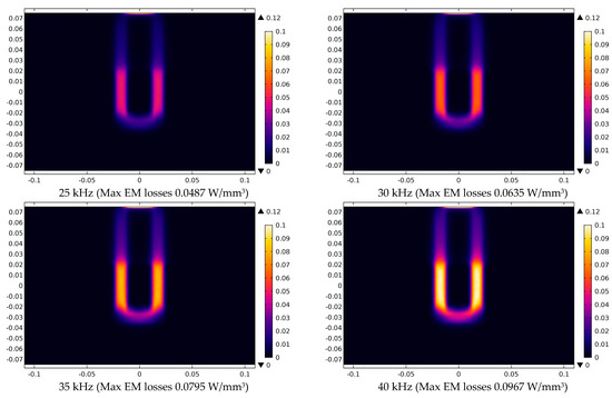 Figure 10 shows that with the increase of the EM field’s operating frequency, the volumetric losses within the molybdenum sheet increase almost linearly. The experiment was realized for the range from 20 kHz up to 40 kHz. Within this range, the saturation of ferrite material is avoided. The optimal operation point for this experiment was reached at 40 kHz. Above this value, the magnetic saturation will cause a decrease in the value of inductance; thus, the coupling shall also be disturbed, and the required heat rate within the molybdenum sheet shall be insufficient.