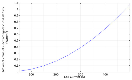 The dependency of maximal electromagnetic losses within the molybdenum sheet on the value of the coil’s current.