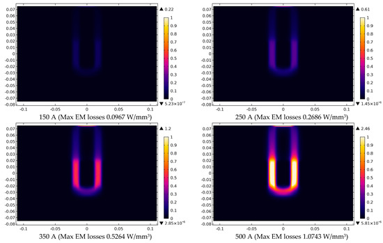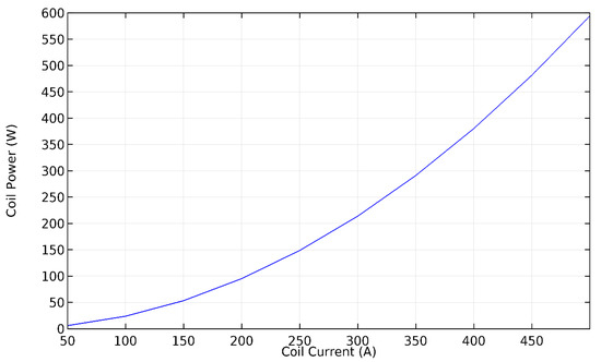 Figure 11 and Figure 12 show that with the increase of the coil’s current, the sheet’s volumetric losses and the generated power of the coil rises. The limitation within this experiment was given on the current value, which cannot exceed 500 A due to the electrical parameters of the heating element’s conductor.