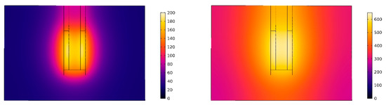 Simultaneously, the temperature distribution within the Mo sheet’s surface was recorded during the time-dependent simulation (Figure 14). Figure 14 is showing the temperature distribution for the parameter settings from Table 4, Table 5 and Table 6. The simulation has time-dependency; thus, the first result is valid for 10 s of the heating process, while the second is valid for 130 s of the heating process. It is seen that the maximum temperature is located around the heating element and reaches 650 °C.