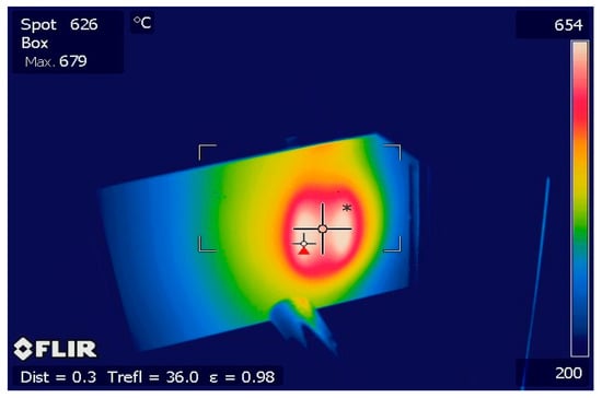 After getting relevant information for the optimal operational parameters setting, the experiment defined by all optimal measures was realized. Figure 15 represents the situation as mentioned above, while it is seen that the temperature distribution refers to the results achieved during the simulation result (Figure 14—right). There is a slight difference at the maximum temperature achieved at the Mo sheet hotspot (626 °C) instead of the simulation (607 °C). Even there is a difference, it is evident that the research of the optimal parameter settings of the induction heating through a simulation approach gives satisfying results. The model shall serve for any optimization purposes needed for the induction heating.