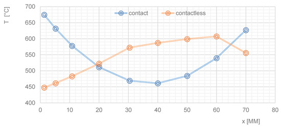 Experimental results of the induction heating supported by the optimal settings received from simulations have been compared to the different heating processes, i.e., contact resistive heating (Figure 16). This comparison demonstrates that induction heating provides a more uniform temperature distribution than alternative heating techniques [24,25,26]. The maximal difference (diffT) between the area with the lowest and the highest temperature for induction heating is lower than resistive heating (diffTind = 150 °C, diffTres = 225 °C). Based on the obtained results, it is expected that with consequent utilization of the translation move during optimal induction heating setting, the thermal distribution within Mo sheet will satisfy the required forming performance.