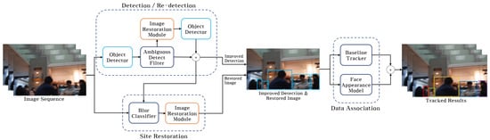 The experimental results show the performance improvement of the main metrics, MOTA and IDF1, in the datasets (except for one of the four datasets). The reason why performance has not improved in some datasets can be interpreted as a problem of excessively low image quality. A dataset with improved performance (MOT16-(10,11,13)) has a high resolution of 1920 × 1080 and has little noise, whereas a dataset without improved performance (MOT16-05) has a low resolution of 640 × 480 and a lot of noise. Since low resolution and a lot of noise cause reasoning failure of the Image Restoration Module and Face Embedding Module, the threshold value used for verification needs to be strict. Therefore, when the image quality is significantly different from the experimental environment, retuning the , , and values to strict values may be advantageous for improving performance. From the overall experimental result, it is validated that our proposed methodology enhances the tracking performance when applied to a general situation.