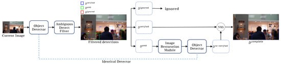 For the classified ambiguous detection set , the re-detection set can be obtained using the following definition. It functions to restore the ambiguous detection regions and then re-detect them by reusing existing detectors. The RestorationModule used to restore damaged images uses a GAN-based image inference model. The detailed procedure of training the module to optimize our model is described in Section 4.1.