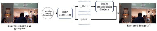 Frameworks for the online MOT problem generally require one or more powerful appearance models. The appearance model aims to determine that a tracklet (an object being tracked) and a detected object are the same object based on their visual information. The appearance model is mainly used when the motion model cannot predict due to the complicated movement of the object, or when re-identification is needed based on the visual data of the object due to the failure of the detection. However, unpredictable noise such as motion blur caused by the movement of an object has a negative effect on the data association because of difficulties in the identification of the appearance model. We thus discriminate whether the detected objects are blurry images or sharp images before the image is used in the appearance model, and then restore the detection regions of those discriminated as blurry images. Figure 3 represents our site restoration method.