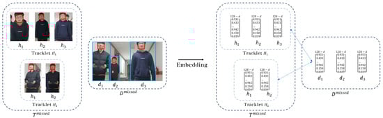 Consequently, the feature vector is obtained from the detection position d, and the feature vector set is obtained from the tracklet H. is defined as which is a set of feature vectors from the past position h of tracklet H. denotes the number of face features derived from H, and satisfies since a face may not be detected at a past position.
