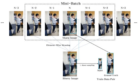 To create one training data pair consisting of a low-resolution blurry image and a high-resolution sharp image, one chunk needs to be configured. This chunk is constructed by selecting an odd number of images from a set of images arranged in a chronological order. From the constructed chunk, the low-resolution blurry image can be obtained by averaging the images and scaling it down to a quarter, and high-resolution sharp images can be obtained from the middle image of the chunk. In order for our image restoration module to focus on restoring a person’s image, we need to exclude the background of the learning image. Therefore, we detect and crop humans in high-resolution sharp images and crop the same positions in low-resolution blurry images to produce training data pairs.
