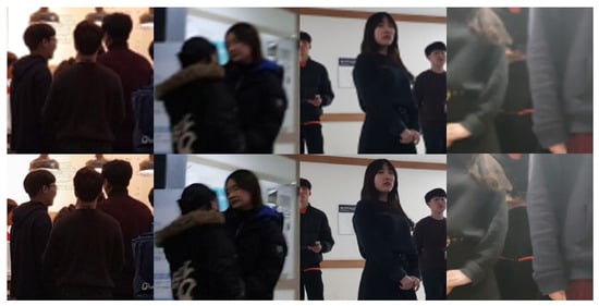 According to the above conditions, images are taken at a 240 Hz refresh rate, the chunk size is set to 7, and datasets of 31,640 pairs (body 21,220 pairs, face 10,420 pairs) are extracted from the images. The configuration for learning is based on the SRGAN default setting with 400 epochs. Figure 6 shows the examples of the restoration using our image restoration module.