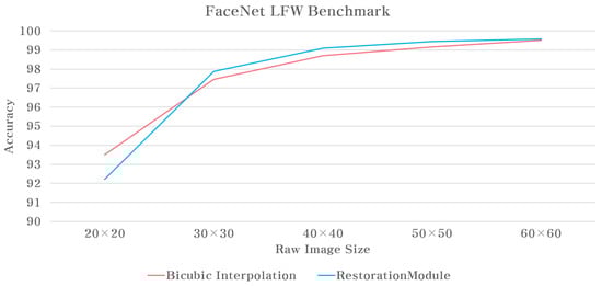 The comparison of the identification performances of the restored images using the bicubic interpolation method and the image restoration module. The FaceNet default settings are used to extract the identification performance. The vertical axis represents the accuracies and the horizontal axis is the size of the original image to be up-sampled.