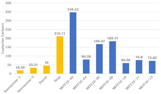 All three datasets used in our experiments are found to show lower Laplacian variances compared to the MOT16 datasets. This indicates that the edge detection by the Laplacian kernel is difficult due to the dynamic movements.