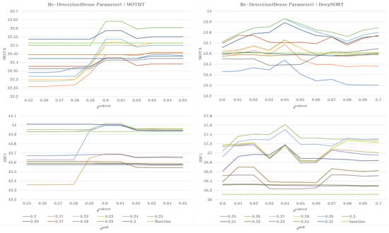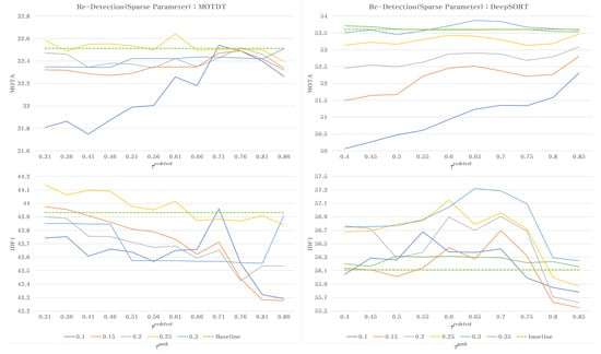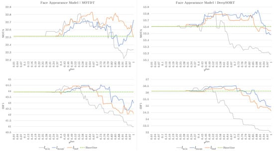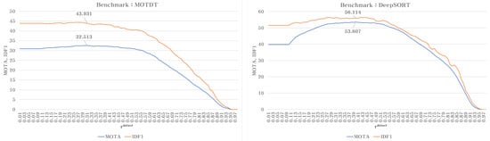 In the experimental results for the baseline shown in Figure 9, the best values of are 0.31 for MOTDT and 0.40 for DeepSORT. We specify MOTA and IDF1 scores for the thresholds as the baseline performance to compare with our methods.