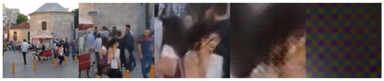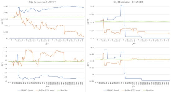 As illustrated in Figure 12, the results show the highest performance for with the value of 24 on MOTDT and for with 70 on DeepSORT. They indicate that MOTDT is effective in severely dynamic situations, but DeepSORT is effective in relatively weakly dynamic situations. The further experimental results represent the predominance of SRGAN in most cases. In fact, the images restored by DeblurGAN tend to make blur effects disappear more clearly. However, when we zoomed in on the image as shown in Figure 13, specific patterns that are newly created are observed. We speculate that this pattern has a negative effect on the appearance model.