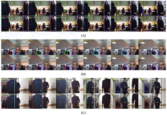 Qualitative examples of our finalized model with all three proposed methods based on the DeepSORT baseline. (A), (B), and (C) denote the experimental results in the Patrol, Interaction-1, and Interaction-2 datasets, respectively.