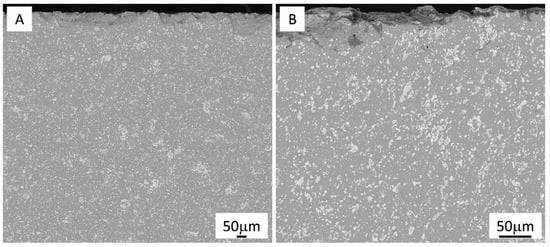 Figure 6 shows the SEM cross-sectional view after WEDM for α-β20T ceramic. Multicomponent ceramic compositions with a high melting point, in which there is a thermal expansion mismatch between constituents, are more susceptible to spalling due to increased stress concentrations at the matrix-particle interphase. Thus, the mechanism of erosion is thermal spalling, in contrast to metals, where the mechanism of material removal is melting and evaporation. It should be pointed out that the width of the heat-affected zone was 120–125 μm, although some cracks were observed in the parent material (Figure 6B). Clearly, the presence of this type of damage in the material directly affects the flexural strength of composites.